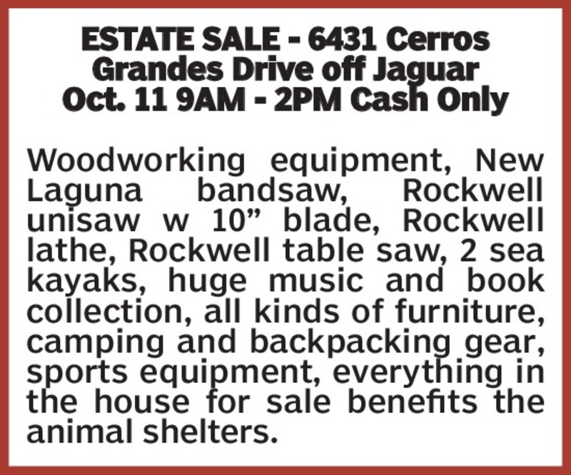 ESTATE SALE - 6431 Cerros Grandes Drive off JaguarOct. 11 9AM - 2PM Cash Only Woodworking equipment, New Laguna bandsaw, Rockwell unisaw w 10” blade, Rockwell lathe, Rockwell table saw, 2 sea kayaks, huge music and book collection, all kinds of furniture, camping and backpacking gear, sports equipment, everything in the house for sale benefits the animal shelters.