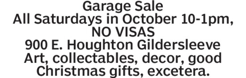 Garage Sale All Saturdays in October 10-1pm, NO VISAS900 E. Houghton Gildersleeve Art, collectables, decor, good Christmas gifts, excetera.