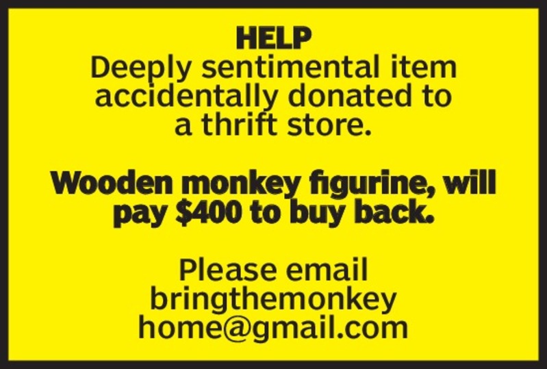 HELP Deeply sentimental item accidentally donated to a thrift store. Wooden monkey figurine, will pay $400 to buy back. Please email bringthemonkeyhome@gmail.com