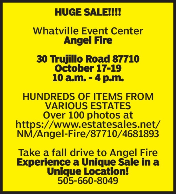 HUGE SALE!!!! Whatville Event CenterAngel Fire 30 Trujillo Road 87710October 17-1910 a.m. - 4 p.m.HUNDREDS OF ITEMS FROM VARIOUS ESTATESOver 100 photos at https://www.estatesales.net/NM/Angel-Fire/87710/4681893Take a fall drive to Angel Fire Experience a Unique Sale in a Unique Location!505-660-8049