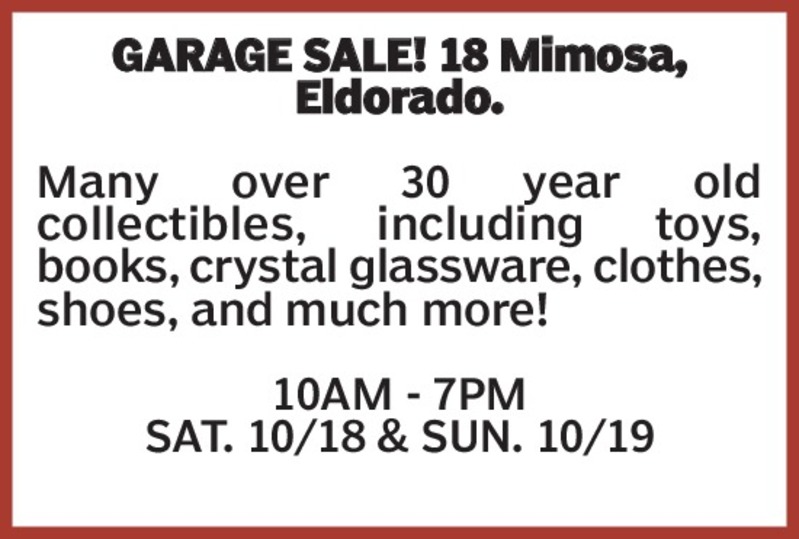 GARAGE SALE! 18 Mimosa, Eldorado. Many over 30 year old collectibles, including toys, books, crystal glassware, clothes, shoes, and much more! 10AM - 7PMSAT. 10/18 & SUN. 10/19