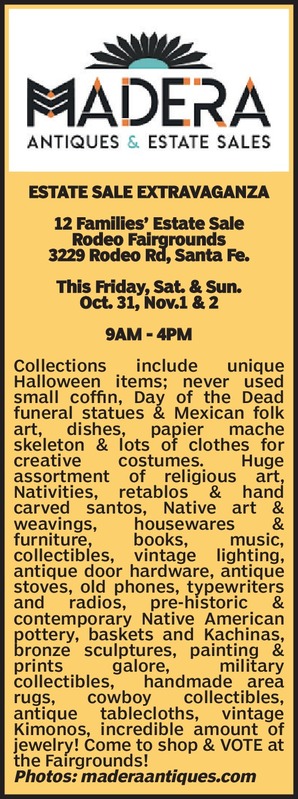 ESTATE SALE EXTRAVAGANZA12 Families’ Estate SaleRodeo Fairgrounds3229 Rodeo Rd, Santa Fe.This Friday, Sat. & Sun.Oct. 31, Nov.1 & 29AM - 4PM Collections include unique Halloween items; never used small coffin, Day of the Dead funeral statues & Mexican folk art, dishes, papier mache skeleton & lots of clothes for creative costumes. Huge assortment of religious art, Nativities, retablos & hand carved santos, Native art & weavings, housewares & furniture, books, music, collectibles, vintage lighting, antique door hardware, antique stoves, old phones, typewriters and radios, pre-historic & contemporary Native American pottery, baskets and Kachinas, bronze sculptures, painting & prints galore, military collectibles, handmade area rugs, cowboy collectibles, antique tablecloths, vintage Kimonos, incredible amount of jewelry! Come to shop & VOTE at the Fairgrounds! Photos: maderaantiques.com