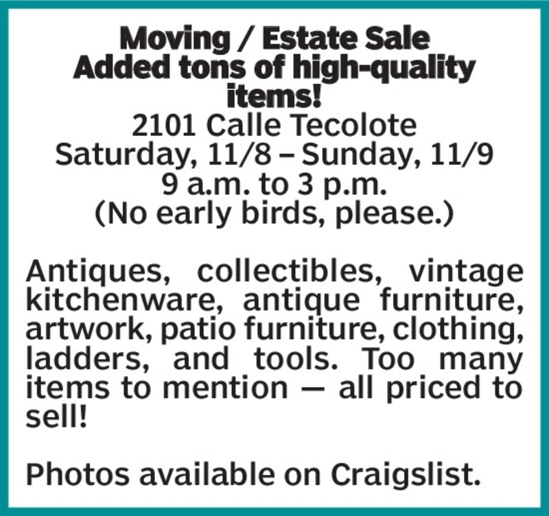 Moving / Estate SaleAdded tons of high-quality items!2101 Calle TecoloteSaturday, 11/8 – Sunday, 11/99 a.m. to 3 p.m. (No early birds, please.)Antiques, collectibles, vintage kitchenware, antique furniture, artwork, patio furniture, clothing, ladders, and tools. Too many items to mention — all priced to sell!Photos available on Craigslist.