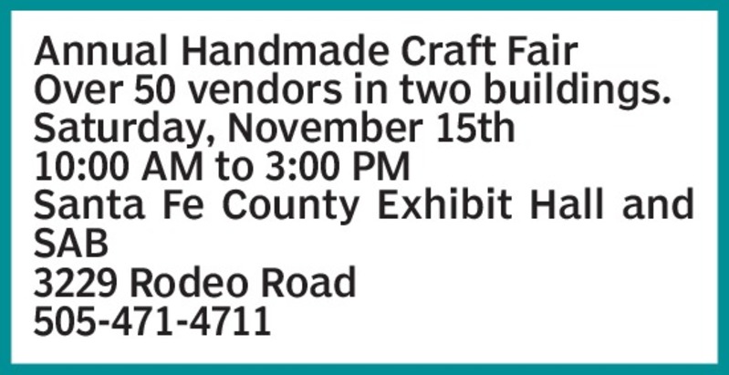 Annual Handmade Craft FairOver 50 vendors in two buildings.Saturday, November 15th10:00 AM to 3:00 PMSanta Fe County Exhibit Hall and SAB3229 Rodeo Road505-471-4711