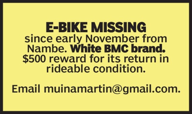 E-bike missing since early November fromNambe. White BMC brand.$500 reward for its return inrideable condition.Email muinamartin@gmail.com.