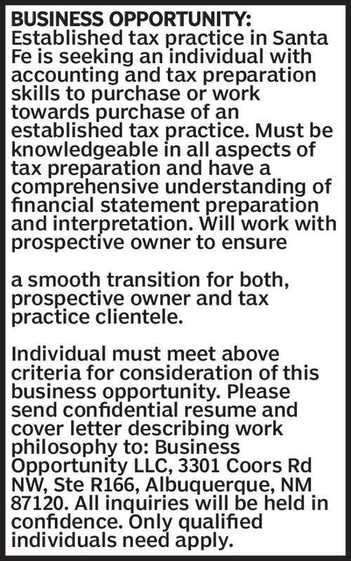 BUSINESS OPPORTUNITY: Established tax practice in Santa Fe is seeking an individual with accounting and tax preparation skills to purchase or work towards purchase of an established tax practice. Must be knowledgeable in all aspects of tax preparation and have a comprehensive understanding of financial statement preparation and interpretation. Will work with prospective owner to ensurea smooth transition for both, prospective owner and tax practice clientele.Individual must meet above criteria for consideration of this business opportunity. Please send confidential resume and cover letter describing work philosophy to: Business Opportunity LLC, 3301 Coors Rd NW, Ste R166, Albuquerque, NM 87120. All inquiries will be held in confidence. Only qualified individuals need apply.