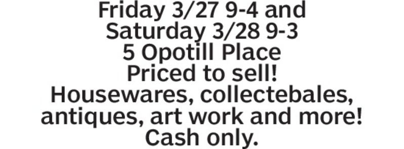 Friday 3/27 9-4 andSaturday 3/28 9-3 5 Opotill Place Priced to sell!Housewares, collectebales, antiques, art work and more!Cash only.