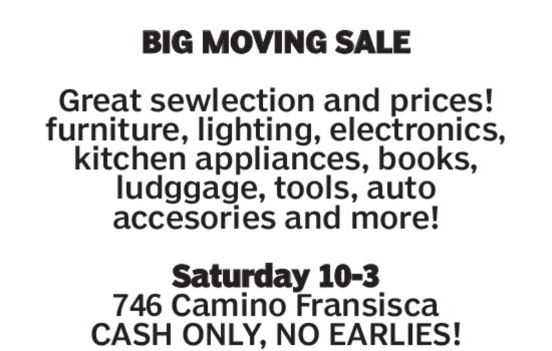 BIG MOVING SALEGreat sewlection and prices!furniture, lighting, electronics, kitchen appliances, books, ludggage, tools, autoaccesories and more!Saturday 10-3746 Camino Fransisca CASH ONLY, NO EARLIES!
