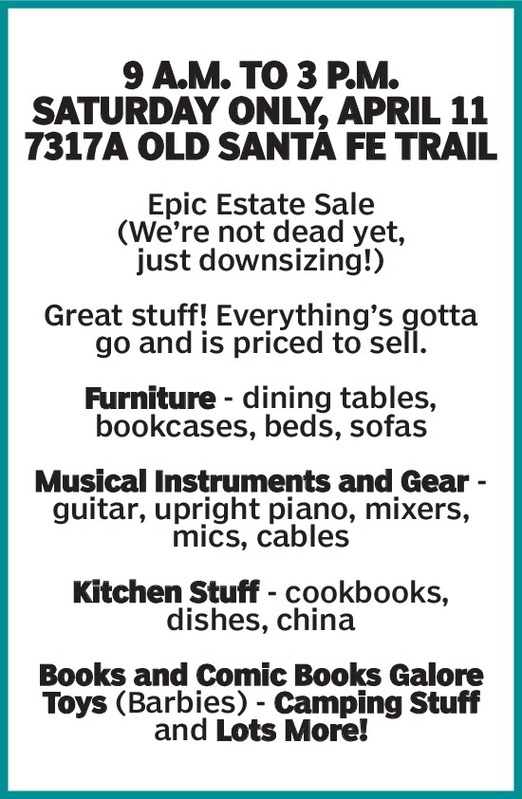 9 a.m. to 3 p.m.Saturday Only, April 117317A Old Santa Fe TrailEpic Estate Sale(We’re not dead yet,just downsizing!)Great stuff! Everything’s gotta go and is priced to sell.Furniture - dining tables, bookcases, beds, sofasMusical Instruments and Gear - guitar, upright piano, mixers,mics, cablesKitchen Stuff - cookbooks, dishes, chinaBooks and Comic Books GaloreToys (Barbies) - Camping Stuffand Lots More!