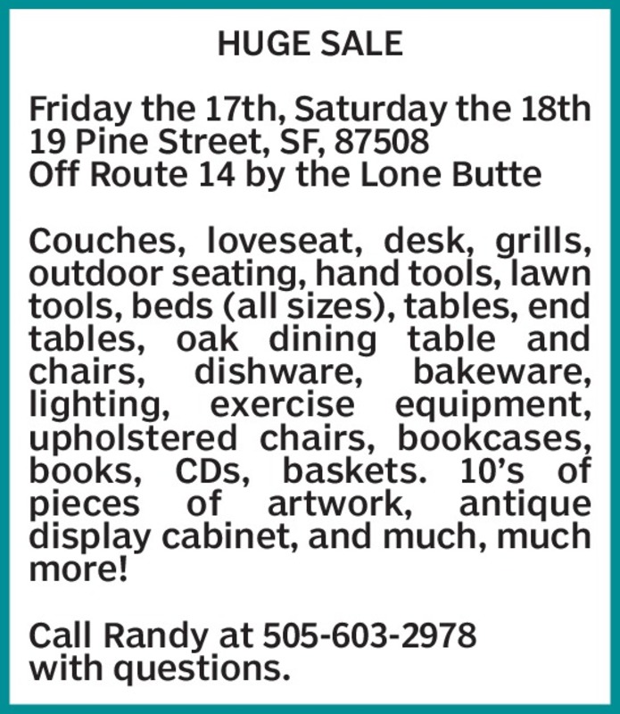 HUGE SALEFriday the 17th, Saturday the 18th19 Pine Street, SF, 87508Off Route 14 by the Lone ButteCouches, loveseat, desk, grills, outdoor seating, hand tools, lawn tools, beds (all sizes), tables, end tables, oak dining table and chairs, dishware, bakeware, lighting, exercise equipment, upholstered chairs, bookcases, books, CDs, baskets. 10’s of pieces of artwork, antique display cabinet, and much, much more!Call Randy at 505-603-2978with questions.