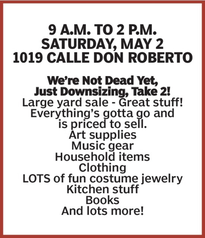 9 a.m. to 2 p.m.Saturday, May 21019 Calle Don RobertoWe’re Not Dead Yet,Just Downsizing, Take 2!Large yard sale - Great stuff!Everything’s gotta go andis priced to sell.Art suppliesMusic gear Household itemsClothingLOTS of fun costume jewelryKitchen stuffBooks And lots more!