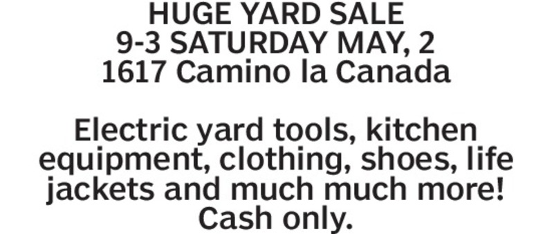 HUGE YARD SALE 9-3 SATURDAY MAY, 21617 Camino la CanadaElectric yard tools, kitchen equipment, clothing, shoes, life jackets and much much more!Cash only.