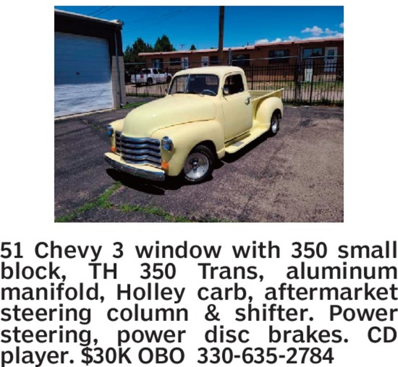 51 Chevy 3 window with 350 small block, TH 350 Trans, aluminum manifold, Holley carb, aftermarket steering column & shifter. Power steering, power disc brakes. CD player. $30K OBO 330-635-2784