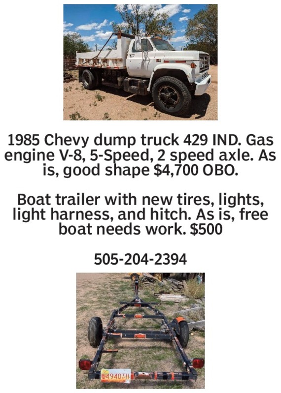 1985 Chevy dump truck 429 IND. Gas engine V-8, 5-Speed, 2 speed axle. As is, good shape $4,700 OBO.Boat trailer with new tires, lights, light harness, and hitch. As is, free boat needs work. $500505-204-2394