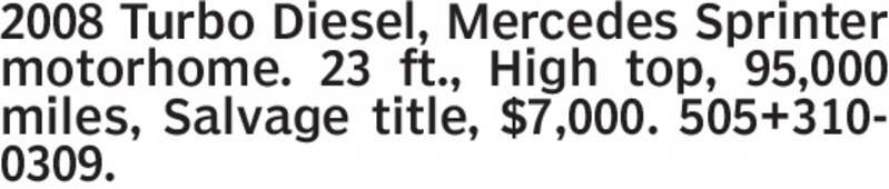 2008 Turbo Diesel, Mercedes Sprinter motorhome. 23 ft., High top, 95,000 miles, Salvage title, $7,000. 505+310-0309.