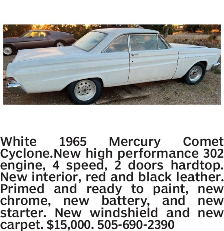 White 1965 Mercury Comet Cyclone.New high performance 302 engine, 4 speed, 2 doors hardtop. New interior, red and black leather. Primed and ready to paint, new chrome, new battery, and new starter. New windshield and new carpet. $15,000. 505-690-2390