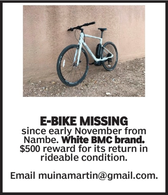 E-bike missing since early November fromNambe. White BMC brand.$500 reward for its return inrideable condition.Email muinamartin@gmail.com.