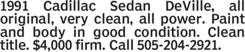 1991 Cadillac Sedan DeVille, all original, very clean, all power. Paint and body in good condition. Clean title. $4,000 firm. Call 505-204-2921.