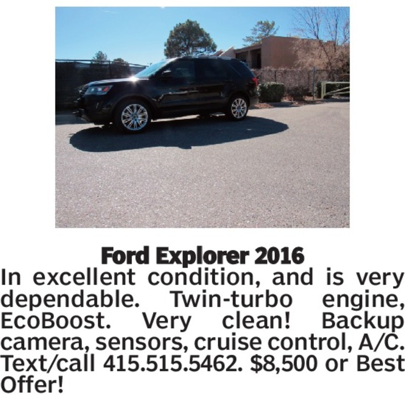 Ford Explorer 2016In excellent condition, and is very dependable. Twin-turbo engine, EcoBoost. Very clean! Backup camera, sensors, cruise control, A/C. Text/call 415.515.5462. $8,500 or Best Offer!