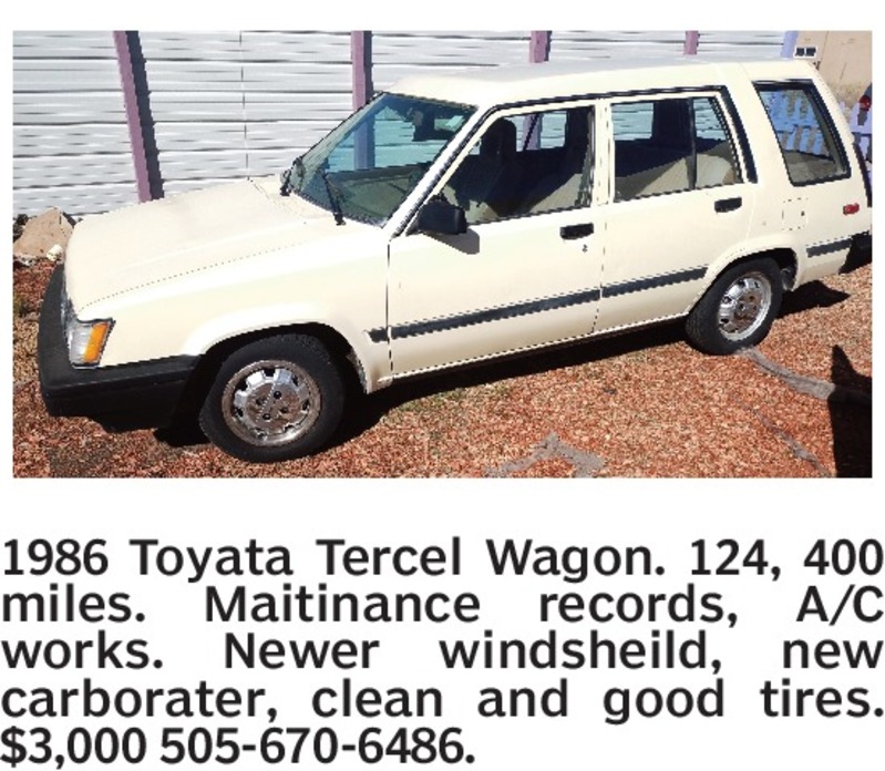 1986 Toyata Tercel Wagon. 124, 400 miles. Maitinance records, A/C works. Newer windsheild, new carborater, clean and good tires. $3,000 505-670-6486.