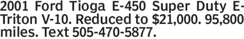 2001 Ford Tioga E-450 Super Duty E-Triton V-10. Reduced to $21,000. 95,800 miles. Text 505-470-5877.