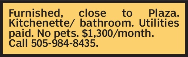 Furnished, close to Plaza. Kitchenette/ bathroom. Utilities paid. No pets. $1,300/month. Call 505-984-8435.