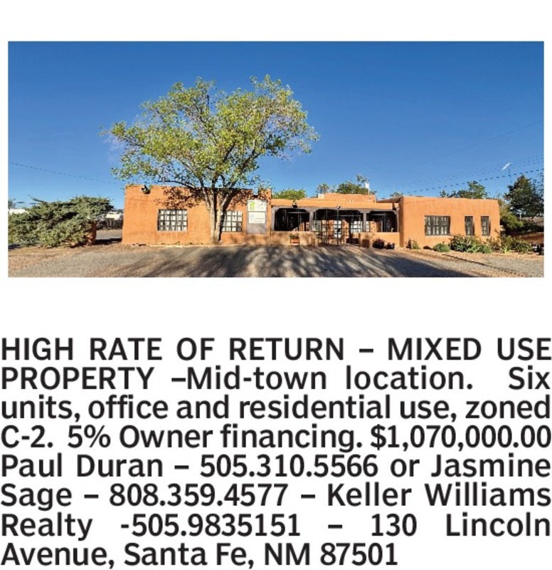 HIGH RATE OF RETURN – MIXED USE PROPERTY –Mid-town location. Six units, office and residential use, zoned C-2. 5% Owner financing. $1,070,000.00Paul Duran – 505.310.5566 or Jasmine Sage – 808.359.4577 – Keller Williams Realty -505.9835151 – 130 Lincoln Avenue, Santa Fe, NM 87501