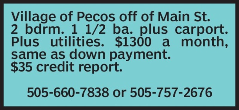 Village of Pecos off of Main St. 2 bdrm. 1 1/2 ba. plus carport. Plus utilities. $1300 a month, same as down payment. $35 credit report. 505-660-7838 or 505-757-2676