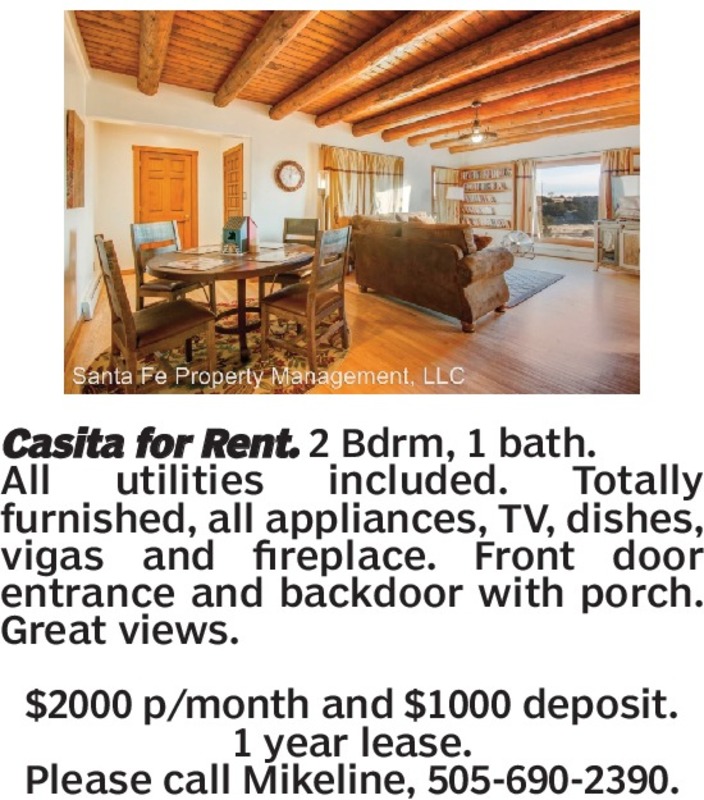 Casita for Rent. 2 Bdrm, 1 bath. All utilities included. Totally furnished, all appliances, TV, dishes, vigas and fireplace. Front door entrance and backdoor with porch. Great views. $2000 p/month and $1000 deposit. 1 year lease. Please call Mikeline, 505-690-2390.
