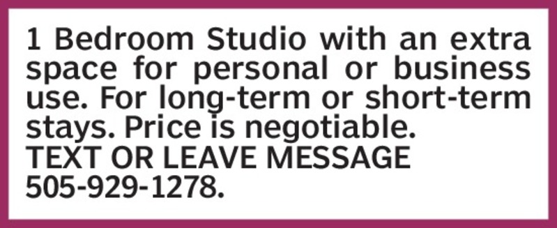 1 Bedroom Studio with an extra space for personal or business use. For long-term or short-term stays. Price is negotiable. TEXT OR LEAVE MESSAGE 505-929-1278.
