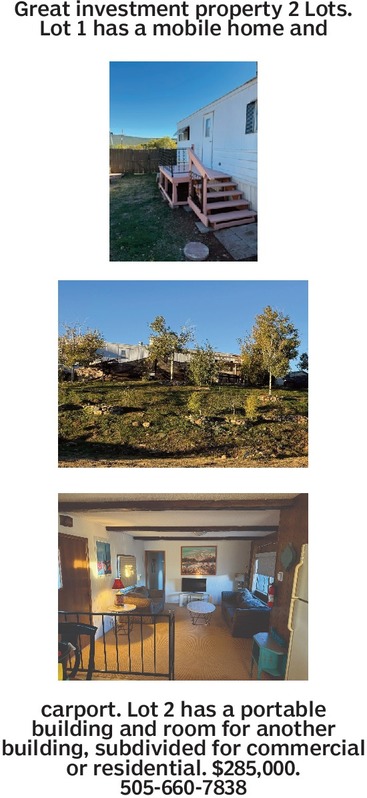 Great investment property 2 Lots. Lot 1 has a mobile home and carport. Lot 2 has a portable building and room for another building, subdivided for commercial or residential. $285,000.505-660-7838