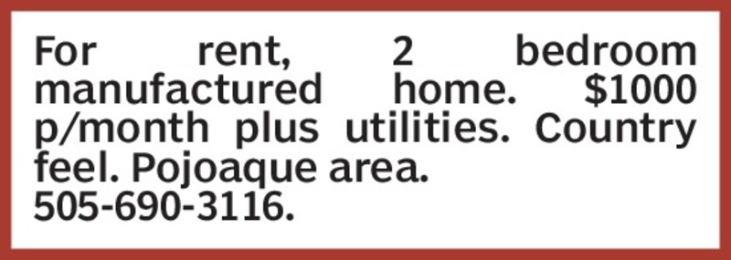 For rent, 2 bedroom manufactured home. $1000 p/month plus utilities. Country feel. Pojoaque area. 505-690-3116.
