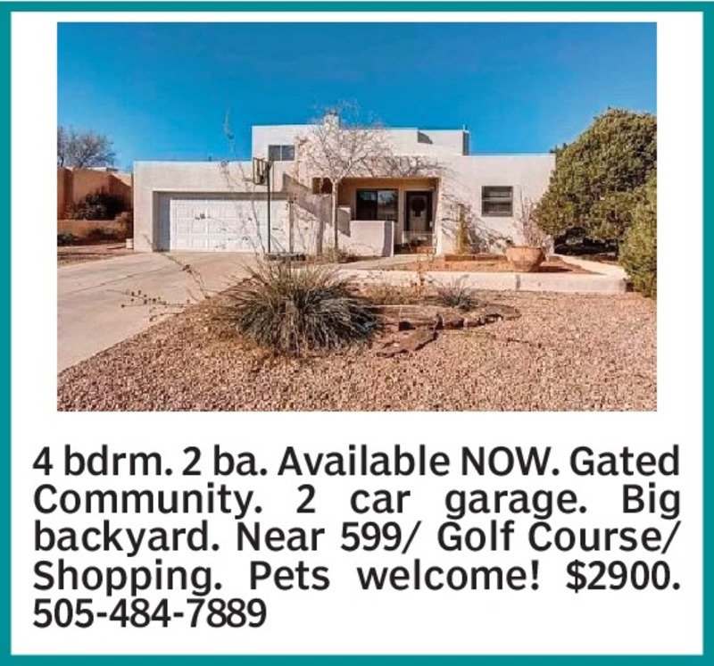 Clean, dead-end location, 3 bedroom, 2 bath, washer/dryer. 2.5 acres. South Santa Fe. Need references. $2,300 per month plus $2,300 deposit. Call, 505-992-1014 or 505-699-9587.