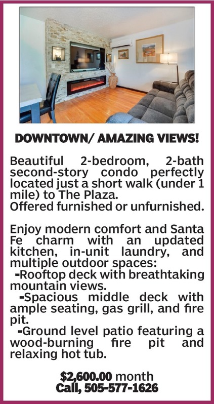 DOWNTOWN/ AMAZING VIEWS!Beautiful 2-bedroom, 2-bath second-story condo perfectly located just a short walk (under 1 mile) to The Plaza. Offered furnished or unfurnished.Enjoy modern comfort and Santa Fe charm with an updated kitchen, in-unit laundry, and multiple outdoor spaces: -Rooftop deck with breathtaking mountain views. -Spacious middle deck with ample seating, gas grill, and fire pit. -Ground level patio featuring a wood-burning fire pit and relaxing hot tub.$2,600.00 month Call, 505-577-1626