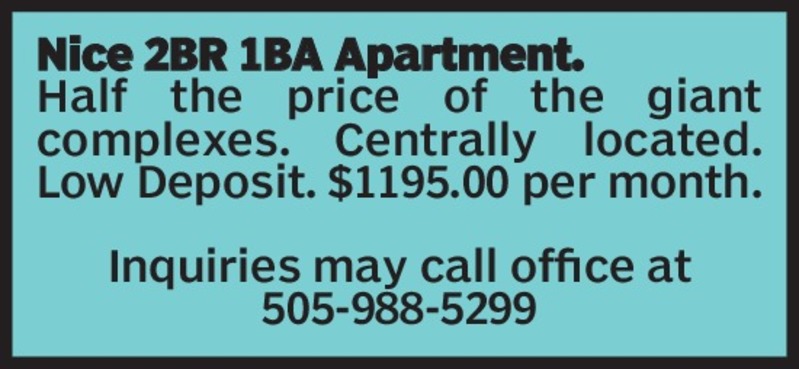 Nice 2BR 1BA Apartment. Half the price of the giant complexes. Centrally located. Low Deposit. $1195.00 per month. Inquiries may call office at 505-988-5299