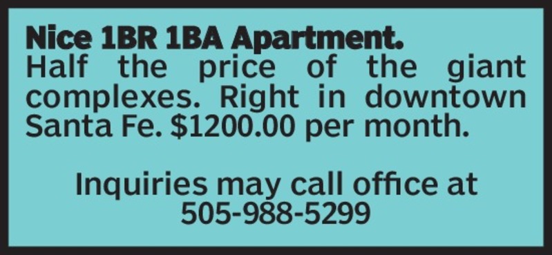 Nice 1BR 1BA Apartment. Half the price of the giant complexes. Right in downtown Santa Fe. $1200.00 per month. Inquiries may call office at 505-988-5299