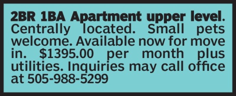 2BR 1BA Apartment upper level. Centrally located. Small pets welcome. Available now for move in. $1395.00 per month plus utilities. Inquiries may call office at 505-988-5299