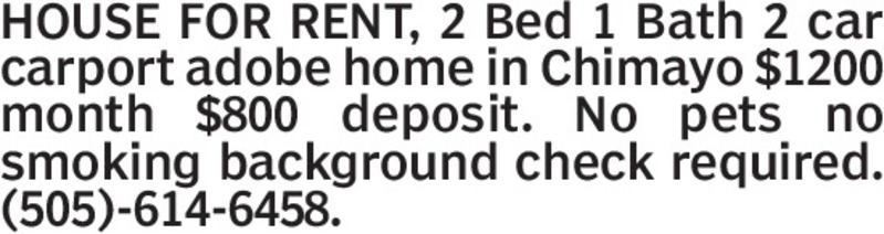 HOUSE FOR RENT, 2 Bed 1 Bath 2 car carport adobe home in Chimayo $1200 month $800 deposit. No pets no smoking background check required. (505)-614-6458.