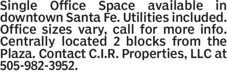 Single Office Space available in downtown Santa Fe. Utilities included. Office sizes vary, call for more info. Centrally located 2 blocks from the Plaza. Contact C.I.R. Properties, LLC at 505-982-3952.