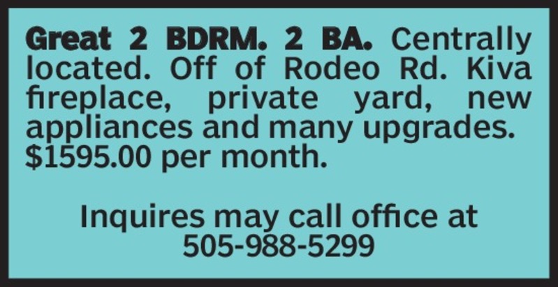 Great 2 BDRM. 2 BA. Centrally located. Off of Rodeo Rd. Kiva fireplace, private yard, new appliances and many upgrades. $1595.00 per month. Inquires may call office at 505-988-5299