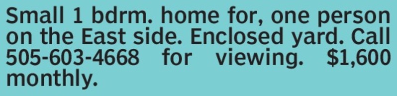 Small 1 bdrm. home for, one person on the East side. Enclosed yard. Call 505-603-4668 for viewing. $1,600 monthly.