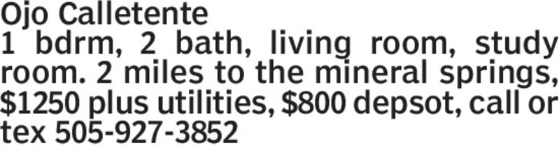 Ojo Calletente 1 bdrm, 2 bath, living room, study room. 2 miles to the mineral springs, $1250 plus utilities, $800 depsot, call or tex 505-927-3852