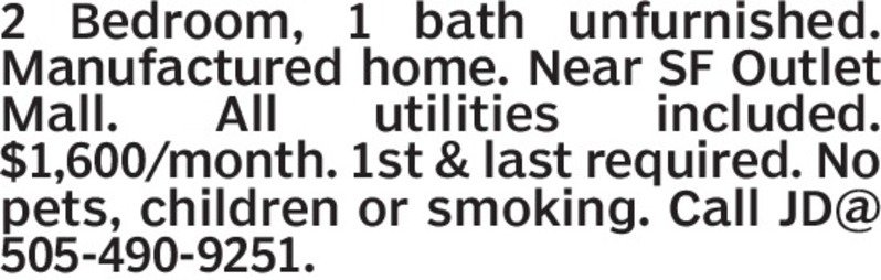 2 Bedroom, 1 bath unfurnished. Manufactured home. Near SF Outlet Mall. All utilities included. $1,600/month. 1st & last required. No pets, children or smoking. Call JD@ 505-490-9251.