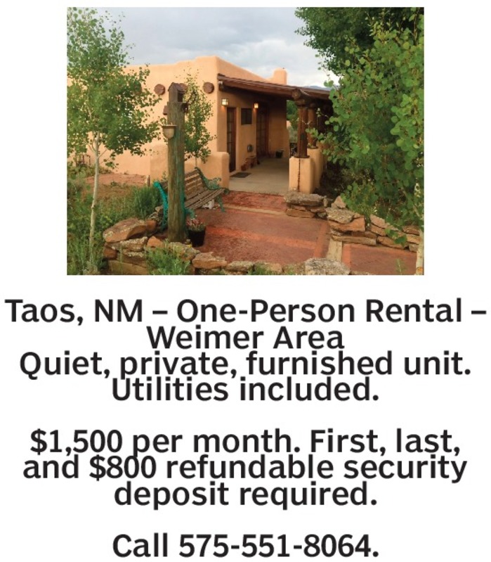 Taos, NM – One-Person Rental – Weimer AreaQuiet, private, furnished unit. Utilities included.$1,500 per month. First, last, and $800 refundable security deposit required.Call 575-551-8064.
