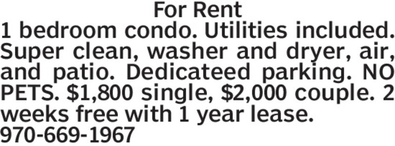 For Rent 1 bedroom condo. Utilities included. Super clean, washer and dryer, air, and patio. Dedicateed parking. NO PETS. $1,800 single, $2,000 couple. 2 weeks free with 1 year lease. 970-669-1967