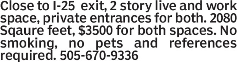 Close to I-25 exit, 2 story live and work space, private entrances for both. 2080 Sqaure feet, $3500 for both spaces. No smoking, no pets and references required. 505-670-9336