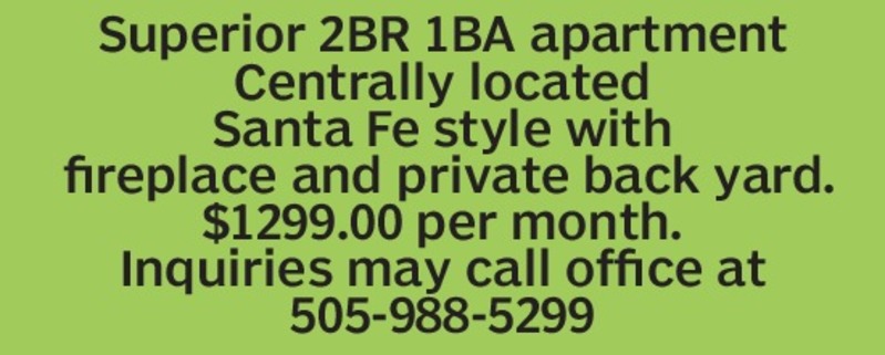Superior 2BR 1BA apartmentCentrally located Santa Fe style with fireplace and private back yard.$1299.00 per month.Inquiries may call office at505-988-5299