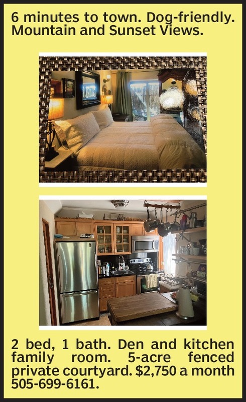 6 minutes to town. Dog-friendly. Mountain and Sunset Views. 2 bed, 1 bath. Den and kitchen family room. 5-acre fenced private courtyard. $2,750 a month 505-699-6161.