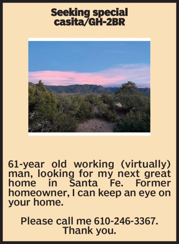 Seeking specialcasita/GH-2BR61-year old working (virtually) man, looking for my next great home in Santa Fe. Former homeowner, I can keep an eye on your home.Please call me 610-246-3367.Thank you.