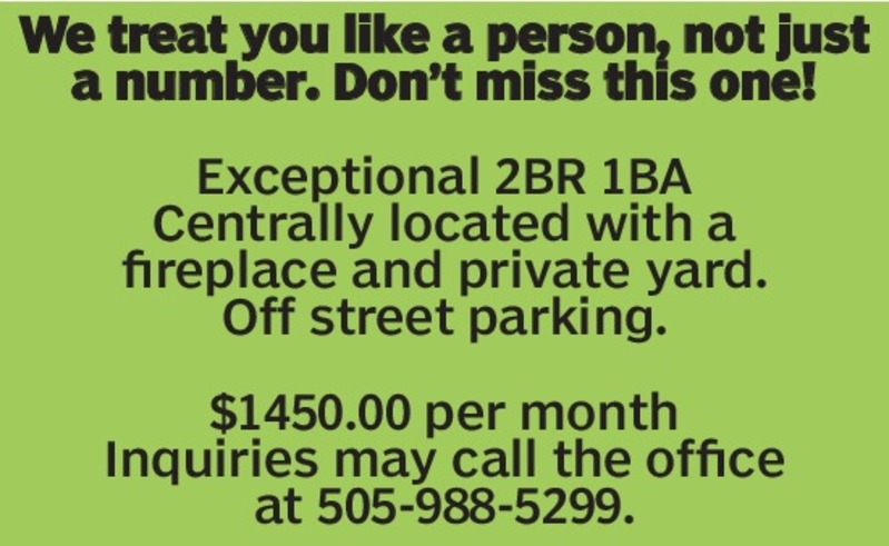 We treat you like a person, not just a number. Don’t miss this one! Exceptional 2BR 1BACentrally located with afireplace and private yard.Off street parking.$1450.00 per monthInquiries may call the officeat 505-988-5299.